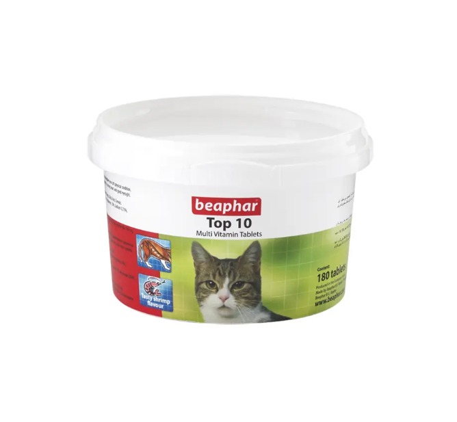 مولتی ویتامین گربه تاپ تن کمپانی بیفار با داشتن ویتامین های ضروری، مواد معدنی و عناصر کمیاب تقویت قوای جسمانی و شادابی همچنین جلوگیری از ریزش مو گربه شما را تضمین مینماید. این مکمل در گربه های جوان موجب تقویت رشد طبیعی و استحکام استخوانها و دندانها، شادابی و سلامت پوست و مو و همچنین درخشش چشمها می گردد. در گربه های مسن تاپ ۱۰ موجب سرزندگی و شادابی می گردد. این مکمل همچنین حاوی ال کارنیتین بوده که موجب تقویت عضلات میگردد.